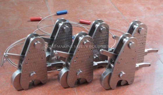 2. خطاف تحرير الرافعة: عندما يكون الخطاف محملاً، اسحب مقبض غلاف الزنبرك بالدبوس إلى وضع "التحرير". عندما يكون الخطاف غير محمل، يمكن لمقبض غلاف الزنبرك الوصول تلقائيًا إلى وضع "خطاف التحرير"، ثم يحرر قارب النجاة الخطاف.